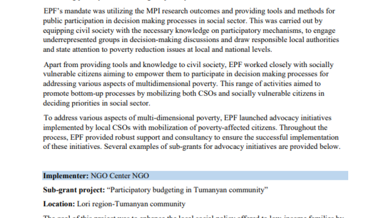 “Community Poverty Reduction “Know-How” project, implemented by a Consortium of four organizations, including CRRC-Armenia, EPF-Armenia, EDRC and Matevosyan Foundation, aimed to mitigate the causes and effects of multidimensional poverty (MPI) in Shirak, Lori and Tavush regions of Armenia by raising public awareness on the idea of multidimensional poverty, building capacities of CSOs and poverty-affected citizens, designing replicable models for addressing poverty and advocating for poverty reduction on the local level. EPF’s mandate was utilizing the MPI research outcomes and providing tools and methods for public participation in decision making processes in social sector. This was carried out by equipping civil society with the necessary knowledge on participatory mechanisms, to engage underrepresented groups in decision-making discussions and draw responsible local authorities and state attention to poverty reduction issues at local and national levels. Apart from providing tools and knowledge to civil society, EPF worked closely with socially vulnerable citizens aiming to empower them to participate in decision making processes for addressing various aspects of multidimensional poverty. This range of activities aimed to promote bottom-up processes by mobilizing both CSOs and socially vulnerable citizens in deciding priorities in social sector. To address various aspects of multi-dimensional poverty, EPF launched advocacy initiatives implemented by local CSOs with mobilization of poverty-affected citizens. Throughout the process, EPF provided robust support and consultancy to ensure the successful implementation of these initiatives. Several examples of sub-grants for advocacy initiatives are provided in the following document.